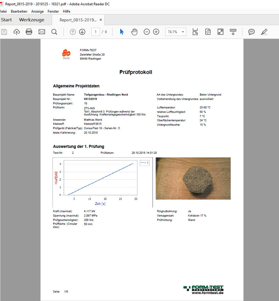 Tapadásvizsgáló készülékeinkhez saját, modern és egyszerű szoftvert fejlesztettünk ki, amely egy végső jelentésben összefoglalja az összes releváns vizsgálatot.