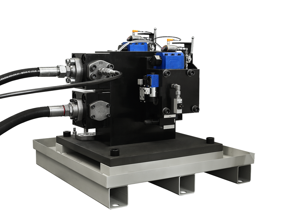 A FORM+TEST elosztóállomásai segítségével ez a feladat egyszerűen és hatékonyan megoldható. Az elosztóállomások 260 l/perc és 1040 l/perc közötti szabványos méretekben, illetve ezen felüli speciális méretekben kaphatók. Különböző szeleptömbökkel szerelhetők fel 65 l/min és 520 l/min között, speciális méretekben pedig még ennél is többel. A szeleptömbök száma utólag növelhető, amíg a teljes áramlási sebesség el nem éri az elosztóállomás kapacitáshatárát. Ez teszi a FORM+TEST elosztóállomásokat rugalmasan alkalmazhatóvá az esetleges bővítésekhez. Az elosztóállomások a környezetvédelmi előírások és a munkavédelem biztosítása érdekében olajteknővel vannak felszerelve az esetleges szivárgások felfogására. Dinamikusan működtetett rendszerek esetén az elosztóállomáshoz további nyomásakkumulátorok is csatlakoztathatók.